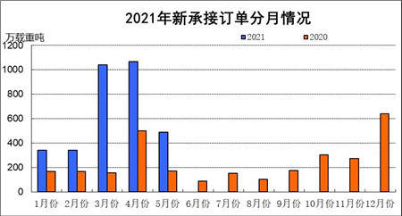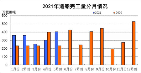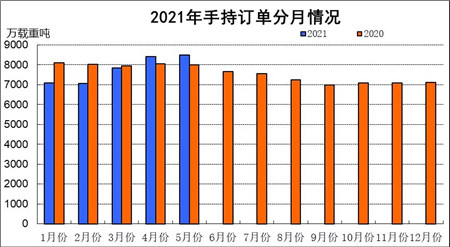 1~5月份,全国造船完工1686.4万载重吨,同比增长26.6%。承接新船订单3273.8万载重吨,同比增长182.6%。5月底,手持船舶订单8500.4万载重吨,同比增长6.4%,比2020年底手持订单增长19.5%。