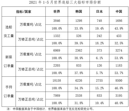 1~5月,我国造船完工量、新接订单量、手持订单量分别占世界市场份额的43.9%、53.9%和46.8%。