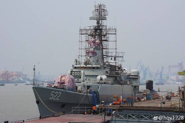 另一艘正在改装的战舰,应该是053H3型(江卫II)型护卫舰连云港舰(舷号522),它和姐妹舰嘉兴舰(舷号521)已被孟加拉国海军“预订”,计划经过针对性改装后下半年抵达孟加拉国,比起铜陵舰,053H3型建造了10艘之多,8单元的红旗7舰空导弹紧凑许多也有效不少,成为2000年后中国海军的绝对主力。