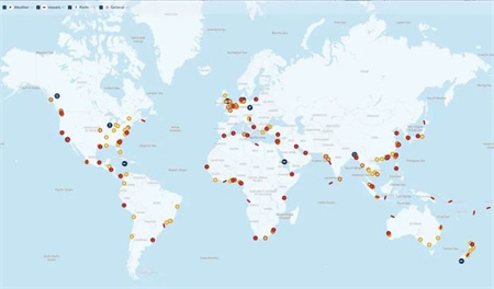8月2日全球港口拥堵情况(红点代表船舶群,橙色代表拥堵或运营中断的港口)