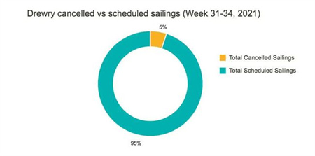 在全球主要航线的496个航次中,第31周至34周期间,已取消24个航次,取消率为5%。