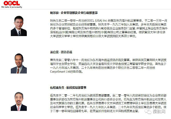 一份看似普通的公告,细心的网友可能已经发现,新“晋升”的中远海控副总经理名单中,有三位人士来自东方海外航运董事会核心高层,他们是:东方海外企业策划部及企业行政部董事姚尔欣先生,东方海外航运航线贸易部董事伍绍裘先生,东方海外资讯总裁萧启豪先生!