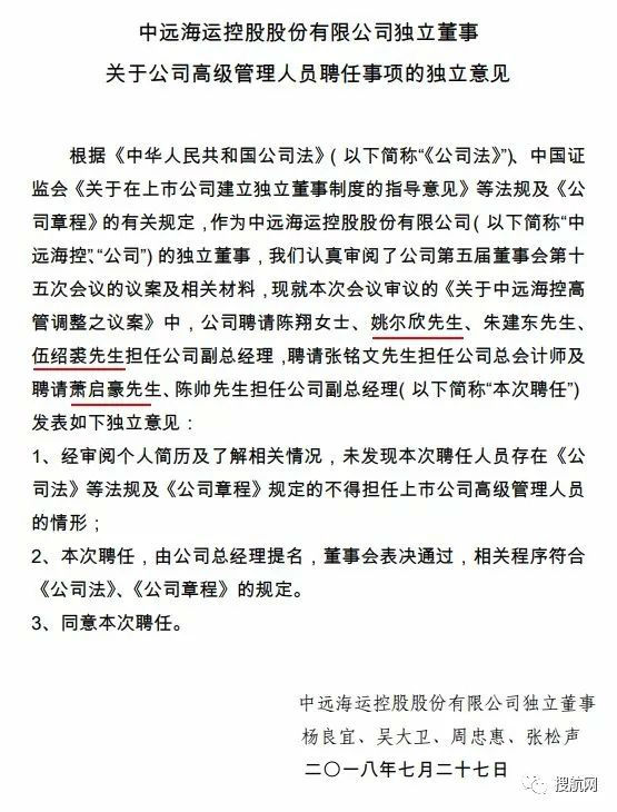据搜航网获悉,上周五(7月27日)中远海控发布公告,宣布董事会审议通过了《中远海控关于高管调整之议案》,批准陈翔、姚尔欣、朱建东、伍绍裘、萧启豪、陈帅任中远海控副总经理,张铭文担任中远海控总会计师(其职责范围与原财务总监相同),即日起生效。