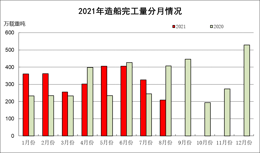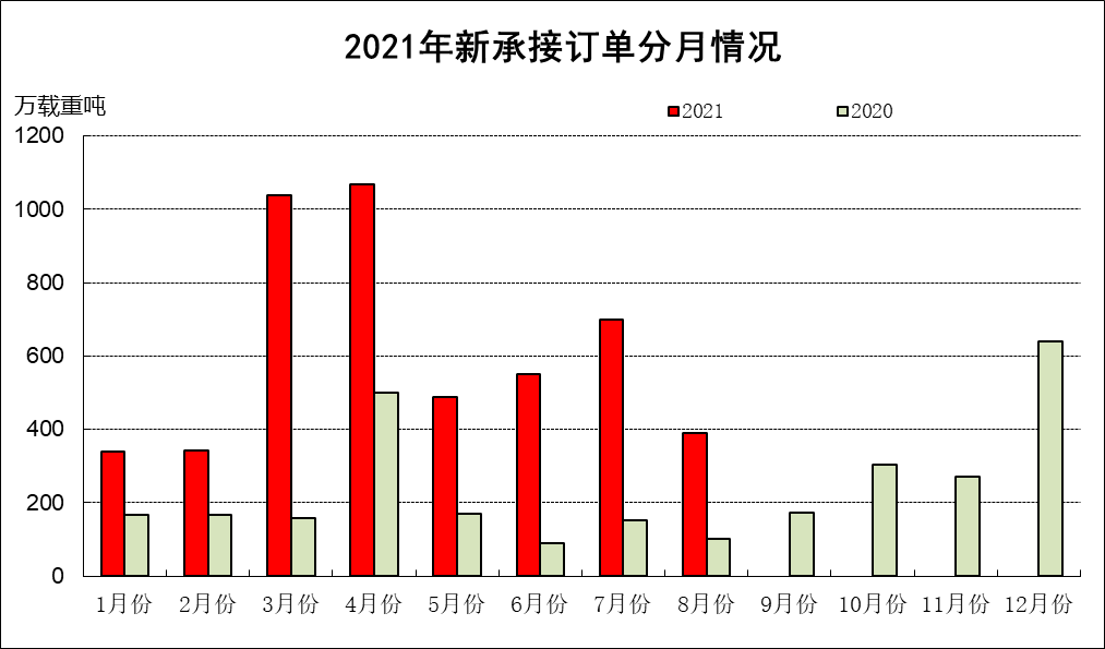 1~8月份,全国造船完工2626万载重吨,同比增长9.0%。承接新船订单4911万载重吨,同比增长227.2%。8月底,手持船舶订单9147万载重吨,同比增长26.0%,比2020年底手持订单增长28.6%。