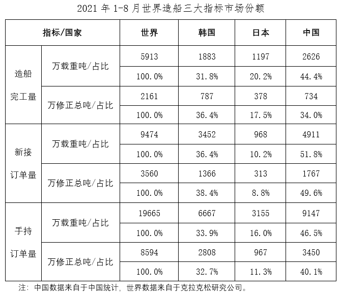 1~8月,我国造船完工量、新接订单量、手持订单量分别占世界市场份额的44.4%、51.8%和46.5%。