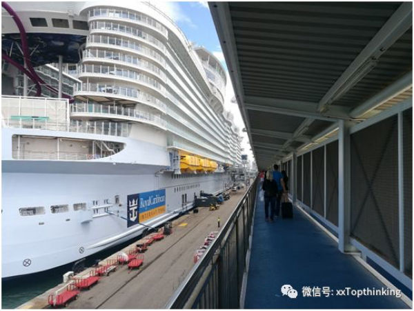 在登船厅,拿出打印的船票,现场拍照,登船手续完毕。前后共15分钟就能够到达房间。登船桥并非完全封闭,面向船舶的方向是开口的,更容易给壮观的邮轮拍照。在一些比较大的港口都会有登船桥,但是稍小的港口没有登船桥,游客从2层与码头之间稍微倾斜的通道上下船,也很方便。更重要的是,这种上下船模式,乘客可以充分利用船内的电梯,因此更为快捷。在笔者看来,登船桥并非必备的邮轮码头装备。当然,如果游客上下比较多,登船桥的通道和2层的通道同时打开,能够更快地配合旅客上下船。登船时手里并没有房卡,船卡在房间门口的一个小纸袋中存放,到了房间门口就可以拿卡开门,这也与国内邮轮登船稍有不同。