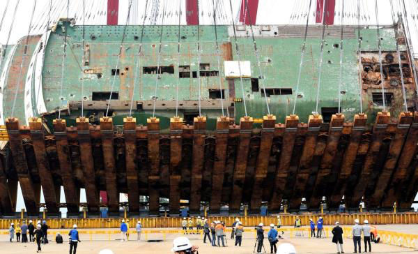2018年5月10日在韩国全罗南道木浦新港码头拍摄的“世越”号沉船船体扶正作业现场。(新华社/纽西斯通讯社)