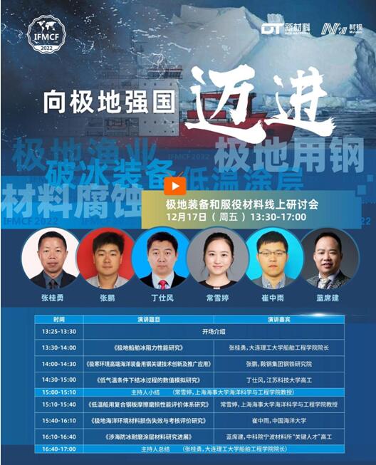 雪龙号二次出征南极引发广泛关注,在此背景下,迈向极地强国线上研讨会将于本周五13:30开始,大连理工、上海海事、鞍钢、海洋大学、宁波材料所、江苏科技大学等单位将针对极地装备和服役材料,分享最新研究成果。