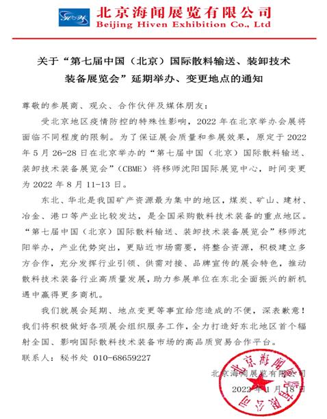 附:关于“第七届中国(北京)国际散料输送、装卸技术装备展览会”延期举办、变更地点的通知