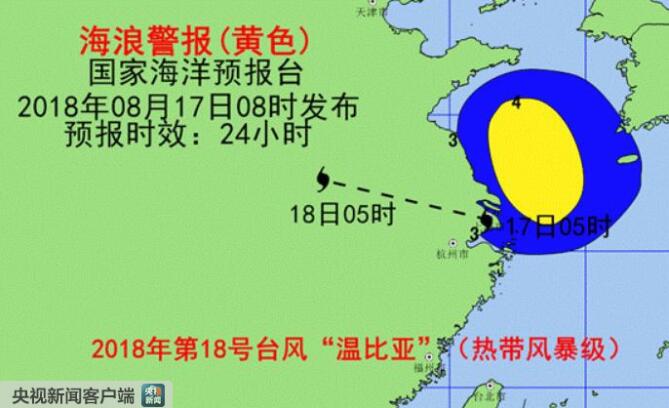 受今年第18号台风“温比亚”(热带风暴级)的影响,预计:8月17日中午到18日中午,黄海南部、东海北部将出现3到4.5米的大浪到巨浪区;上海、江苏近岸海域将出现2到3.5米的中浪到大浪,该近岸海域海浪预警级别为黄色,山东半岛南部近岸海域将出现1.5到2.8米的中浪到大浪,该近岸海域海浪预警级别为蓝色。