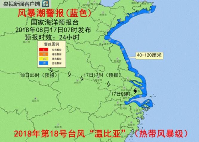 17日7时,国家海洋预报台发布风暴潮Ⅳ级警报(蓝色)。