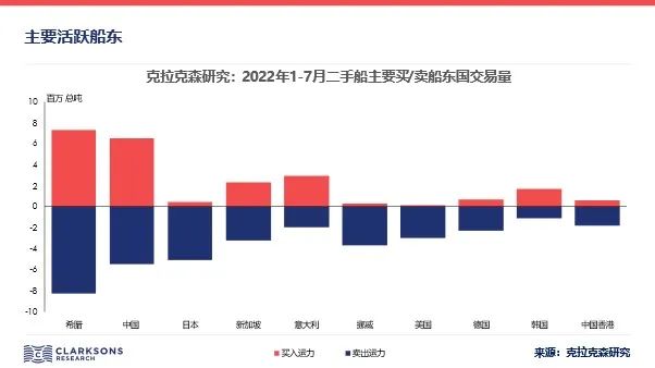 二手船买卖市场,希腊依旧是最活跃的船东国。2022年1-7月,希腊船东买入二手船727万总吨,占到同期二手船买入总量的15%;卖出二手船831万总吨,占到卖出总量的17%。