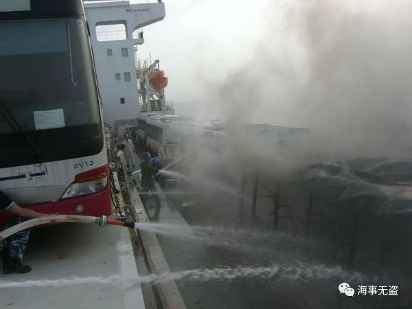 一天早晨六时许,正在执勤防海盗岗的护航安全官李龙飞突然发现,在船舶左舷中部4舱位置紧靠栏杆处的汽车突然冒出浓烟继而窜出火苗。“糟了!着火了!”李龙飞扭身冲进驾驶台:“左舷4舱着火,火情警报”,“护航队兰卡队员上驾驶台值海盗班,其他队员跟我下甲板救火”李龙飞抄着对讲机一边朝甲板跑去一边下达着指令。到达现场后,短短的时间内火苗已经变成熊熊的大火。护航队员和船员们迅速架起了三条皮龙带进行灭火。