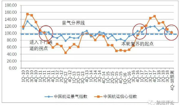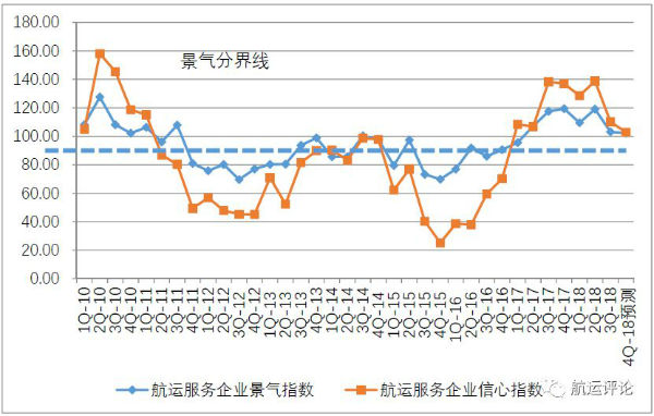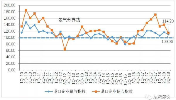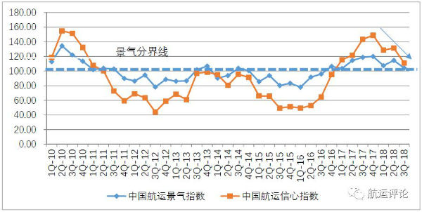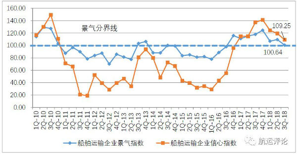2018年10月9日,上海国际航运研究中心发布2018年第三季度中国航运景气报告,报告显示:中国航运业景气度出现下滑,中国航运景气指数为104.15点,较上一季度大幅下滑10.43点;中国航运信心指数为110.99点,较上季度大幅下降20.47点。上海国际航运研究中心中国航运景气指数编制室主任周德全指出,近几个季度中国航运景气指数与信心指数几乎一路下行,都已经逼近100点的景气分界线,中国航运业复苏态势已经基本见顶。