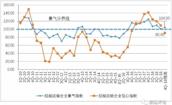 船舶运输企业家对未来信心不足。根据中国航运景气调查显示,2018年第四季度,船舶运输企业的景气指数预计为104.00点,比本季度上涨3.36点,仍处于微景气区间;船舶运输企业信心指数预计为90.40点,较本季度下降18.85点,跌至不景气区间。从各项经营指标来看,尽管营运成本不断提升,但得益于企业运费水平的提升,运力和舱位利通率的提高,企业盈利状况持续向好。其中,干散货运输企业景气指数预计为123.86点,企业总体经营状况继续保持稳定复苏态势。