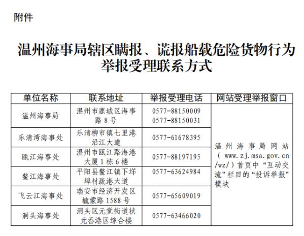附件:温州海事局辖区瞒报、谎报船载危险货物行为举报受理联系方式