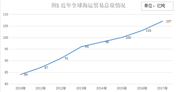 联合国《2018年海运报告》显示,2017年全球海运总产量达107亿吨,较2016年增加了4亿吨(2016年全球海运贸易总量为103亿吨)。在这107亿吨海运贸易总量中,有近一半是干散货运输的贡献。