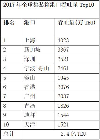 根据联合国《2018年海运报告》,2017年全球集装箱吞吐量约为7.52亿TEU,而来自亚洲的这排名前十的10个集装箱港口,在2017年总共完成了2.4亿TEU集装箱吞吐总量,占2017年全球集装箱吞吐总量的32%。