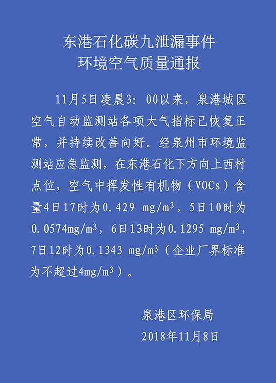 泉州泉港通报碳九泄漏处理情况:大气指标已恢复正常
