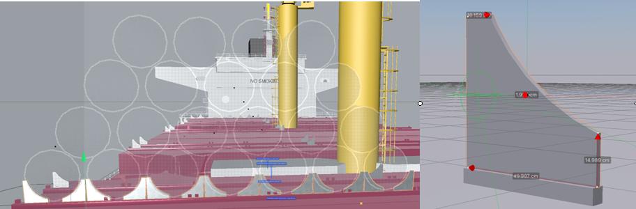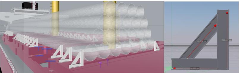 As normal lashing schedule, commonly stoopers are welded by 25B H-beam , All stoppers are arranged on both sides of pipes stack,the supporting height is slightly higher than the pipe’s center of gravity , the distance of single unit is 2 meters per side, in total of 25 units stopper per side and 50 units stopper on both sides . The layout is as follows:
