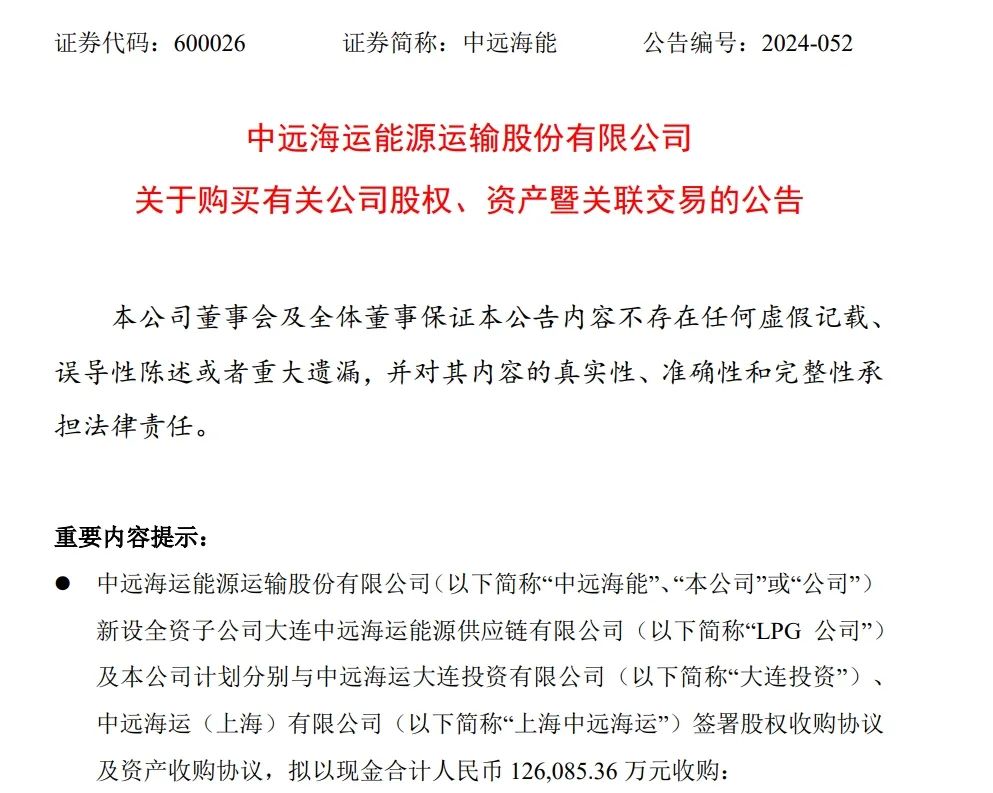 10月14日晚间,中远海能公告,公司及公司新设全资大连中远海运能源供应链有限公司(以下简称“LPG 公司”)计划分别与上海中远海运、大连投资签署股权收购协议及资产收购协议,拟以现金合计12.61亿元收购以下资产和股权:1、大连投资持有的深圳龙鹏70%股权、海南招港87%股权、西中岛港口15%股权以及两艘LPG运输船舶“金桂源”轮和“牡丹源”轮;2、上海中远海运持有的中海化运100%股权、香港化运100%股权。