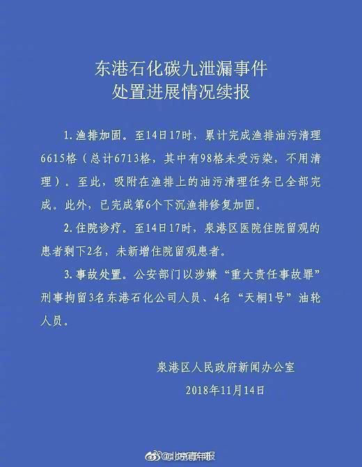 14日,福建省泉州市泉港区人民政府新闻办公室发布东港石化碳九泄漏事件处置进展情况续报。续报称,警方以涉嫌“重大责任事故罪”刑事拘留3名东港石化公司人员、4名“天桐1号”油轮人员。