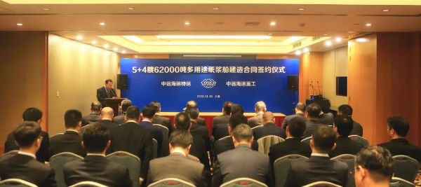 图为“5+4艘62000吨多用途纸浆船建造合同”签字仪式现场图