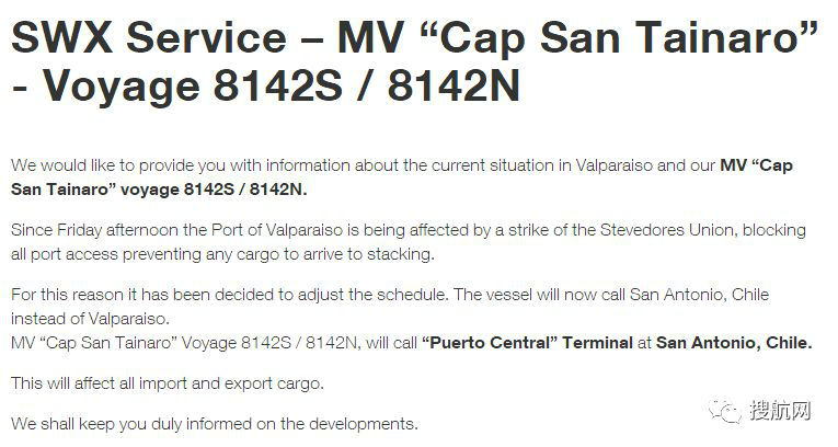 据悉,有近十家船公司共舱的SWX航线的“Cap San Tainaro”集装箱船已经临时改港,将由原挂靠港瓦尔帕莱索港(Valparaiso),改为停靠另外一个港口圣安东尼奥港(San Antonio),并且这并不是唯一的被迫改港的集装箱船,其他一些航线也面临改港或跳港的选择!