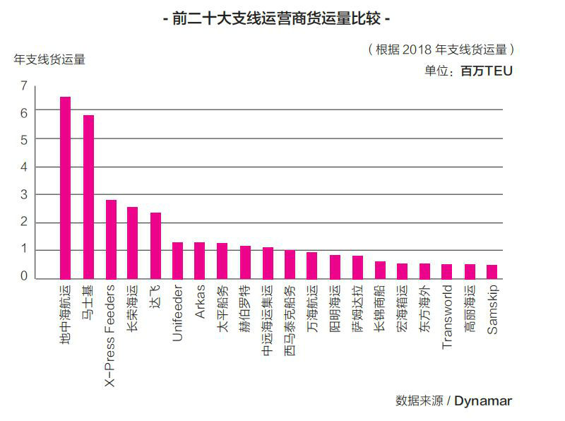 但是,在前五大(年支线货运量超过200万TEU)提供支线运输服务的运营商中,只有一家是纯粹的公共支线运营商。在大型班轮公司中,除了ONE之外,其他大型班轮公司都经营支线运输服务并进入前二十大支线运营商的榜单。包括地中海航运、长荣海运、赫伯罗特和中远海运在内的多数大型船公司,只为自己旗下船舶提供支线运输服务。而马士基和达飞则同时为自己旗下船舶与其他客户提供支线服务。