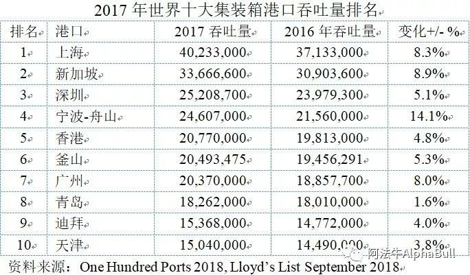 香港港2017年吞吐量为20,770,000 TEU,比上年的19,813,000 TEU增长4.8%。这个城市港口成功地保持了前五名(表1)。