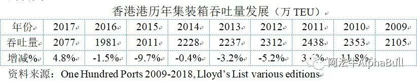 2018年1月至9月,香港港吞吐量为1466万TEU,比上年同期下降5.8%,已被釜山港(1605万TEU,同比增长4.6%)和广州港(1596万TEU)超越。因此,可以预期香港港2018年吞吐量排名很可能掉两个名次,即从第五位掉到第七位。
