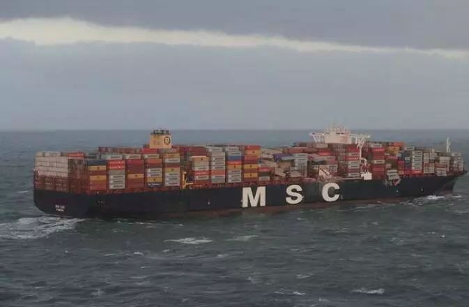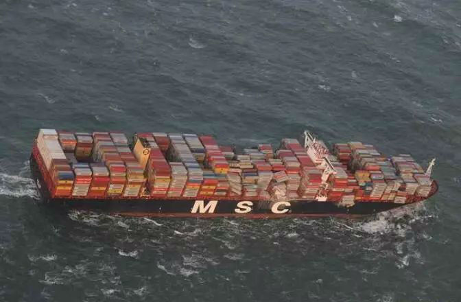 地中海航运19万吨箱船“MSC Zoe”号在航行途中遭遇恶劣天气发生集装箱落海事故。