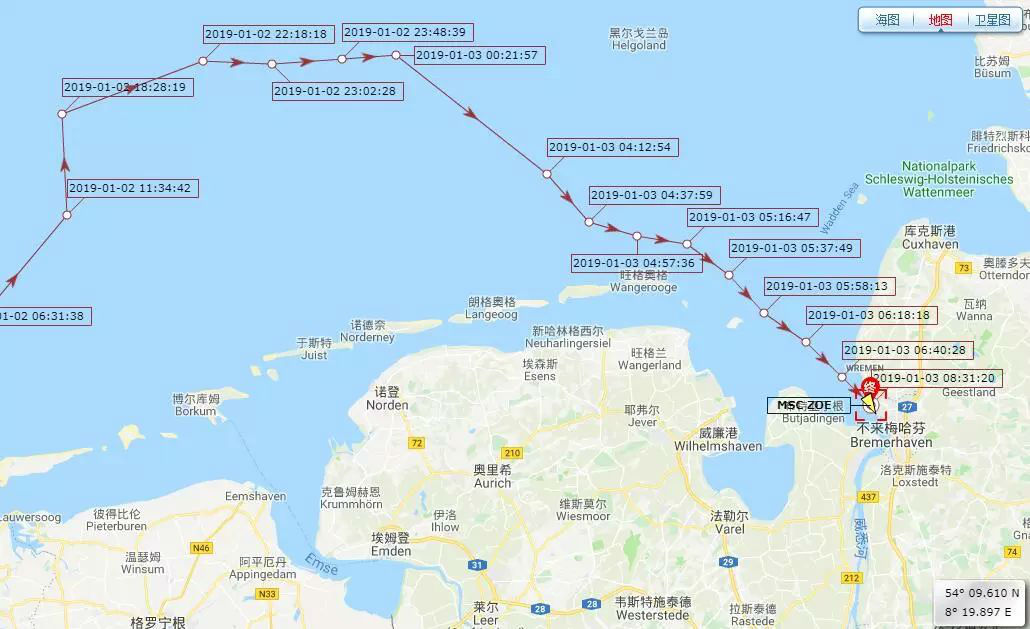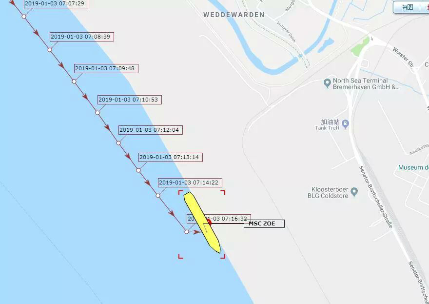 “MSC Zoe”号集装箱船最新航行轨迹,如图所示。