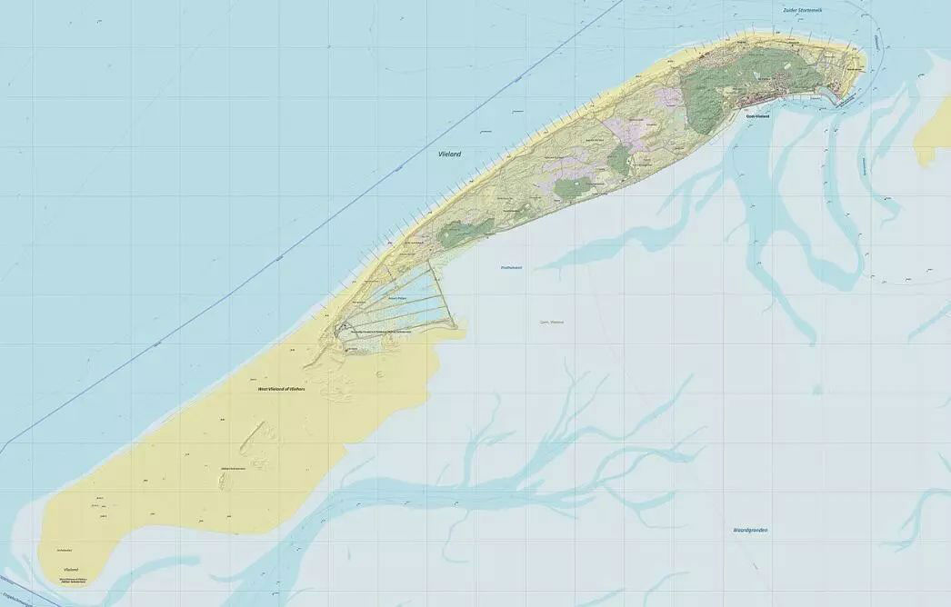 许多集装箱飘落在弗利兰岛和泰尔斯海灵岛的荷兰海岸。(如图弗利兰岛的地形图)