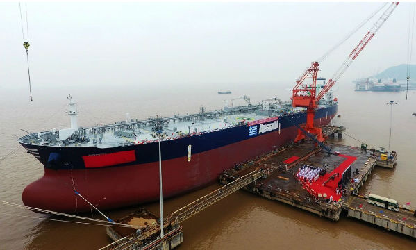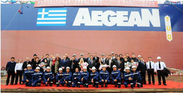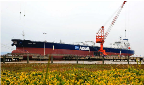 1月3日,舟山中远海运重工为希腊Aegean Shipping公司建造的第二艘11.3万载重吨原油轮“GREEN AURA”在舟山中远海运重工命名交付。