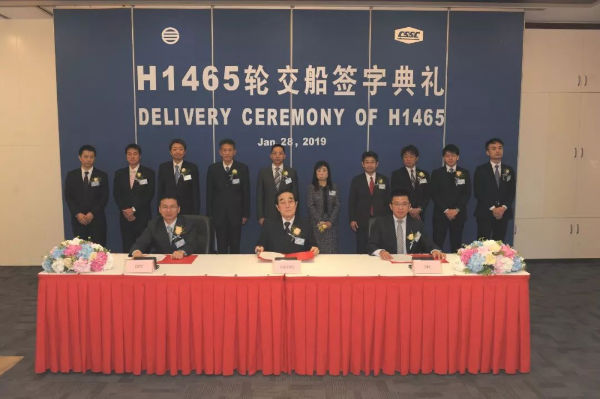 命名交付仪式由外高桥造船总经理助理张松主持。三德船舶社长多贺征志、中船贸易副总经理吴爱军、外高桥造船副总经理周琦分别代表船东方、中船贸易、建造方在协议书上签字。