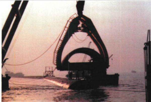 据统计,仅一期工程需要安装的大型水泥块体就达到了2800个。考虑到长江口恶劣的环境,减少潜水员危险的水下作业,工程研发出了多种自动生钩、脱钩的液压吊具。这些吊具的吊装能力达到200吨,可以独自吊起整块坝体。