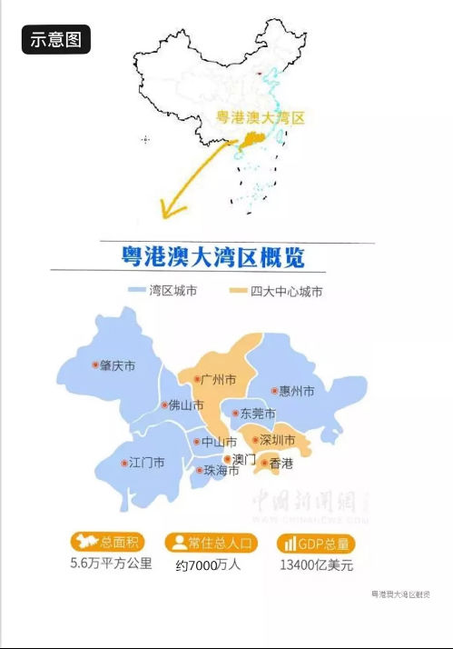 粤港澳大湾区总面积5.6万平方公里,常住总人口6659万,GDP总量超过约1.34万亿美元,是我国开放程度最高、经济活力最强的区域之一。 粤港澳大湾区的发展对标世界三大著名湾区:纽约湾区、旧金山湾区、东京湾区。最新发布的《四大湾区影响力报告(2018):纽约・旧金山・东京・粤港澳》测评结果显示,粤港澳大湾区的经济影响力位列四大湾区之首,整体影响力指数排名第3,高于东京湾区。