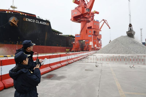 海关关员对进口锰矿实施船边监卸