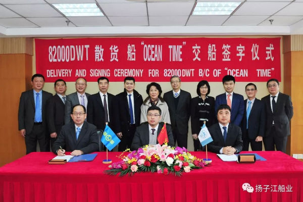 2月19日恰逢中国传统元宵佳节,上午9时28分,各方代表齐聚新扬子造船会议室,“OCEAN TIME”(好时)轮顺利签字交付。