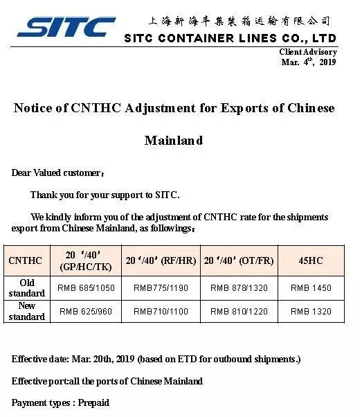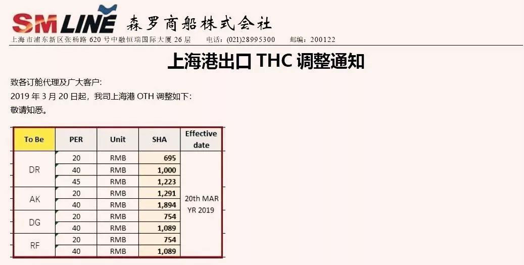 新的THC收费标准将适用于自3月20日起签订的所有即期合同和固定期限合同。