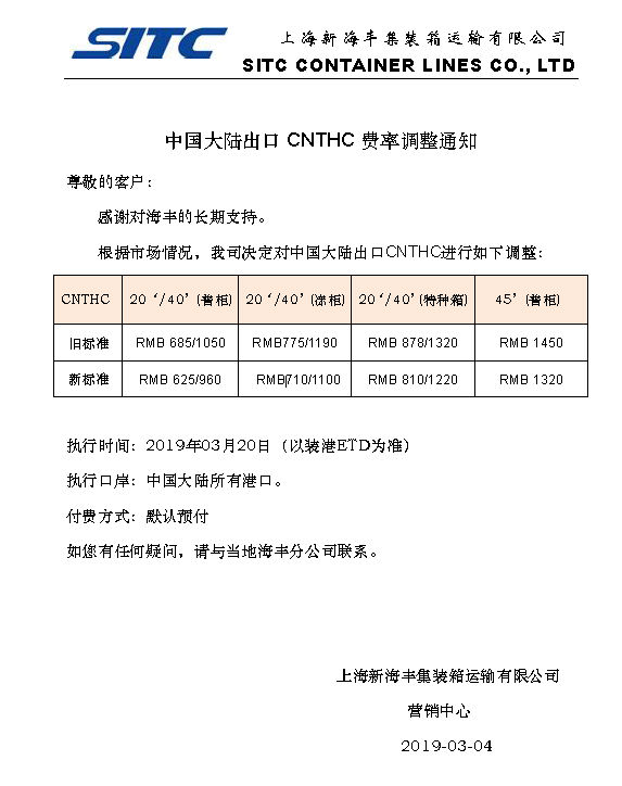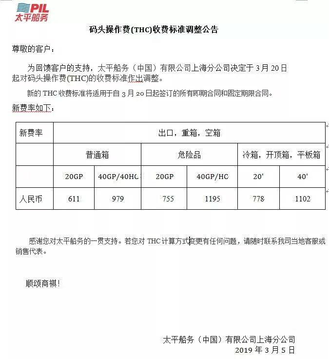 为回馈客户的支持,太平船务(中国)有限公司上海分公司决定于3月20日起对码头操作费(THC)的收费标准作出调整。