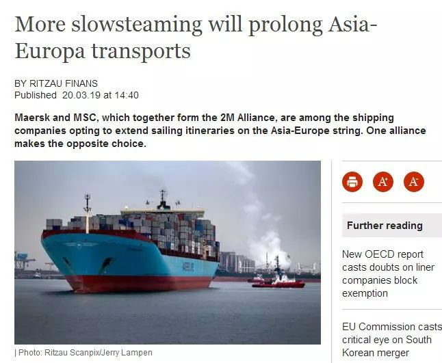 业内权威分析机构Alphaliner在最新一期周报中提到,包括马士基和地中海航运在内的多家班轮公司,将选择在亚欧航线上降低船舶航速,延长航行时间。