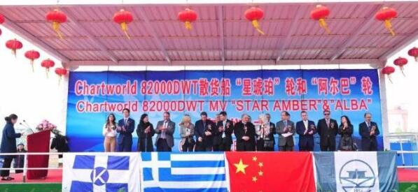 同日,扬子江船业为希腊Chartworld船东建造的82000DWT散货船厂编N2138号“STAR AMBER”(星琥珀)轮和N2139号“ALBA”(阿尔巴)轮在新扬子造船1#码头举行命名仪式。