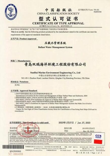 3月20日,青岛双瑞公司获中国船级社CCS代表中国海事主管机关颁发的基于IMO新G8导则的型式认可证书,成为全球首家获此证书的压载水厂商。