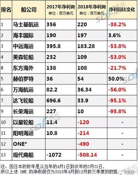 整理2018年全球主要船公司盈利业绩: