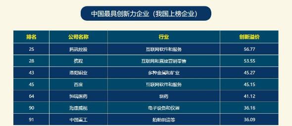 榜单显示,有7家中国企业入榜,他们分别是腾讯控股(第25位)、携程(第28位)、洛阳钼业(第43位)、百度(第45位)、恒瑞医药(第64位)、海康威视(第90位)、中国重工(第91位)。