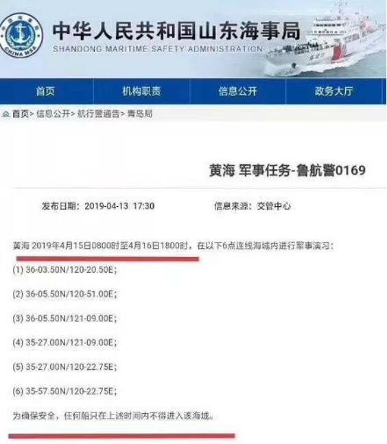 根据山东海事局发布的通知,今天(4月15日)8时到4月16日18时,黄海部分海域不允许任何船只进入。