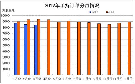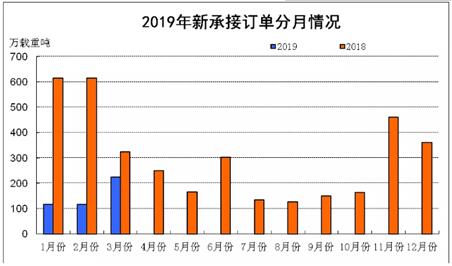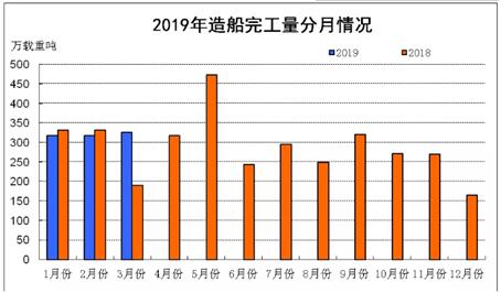 1~3月份,全国造船完工962万载重吨,同比增长12.8%。承接新船订单459万载重吨,同比下降70.4%。3月底,手持船舶订单8428万载重吨,同比下降10%,比2018年底下降5.6%。
