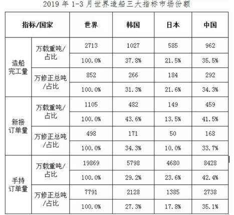 1~3月,我国造船完工量、新接订单量、手持订单量分别占世界市场份额的35.5%、41.5%和42.4%。